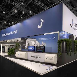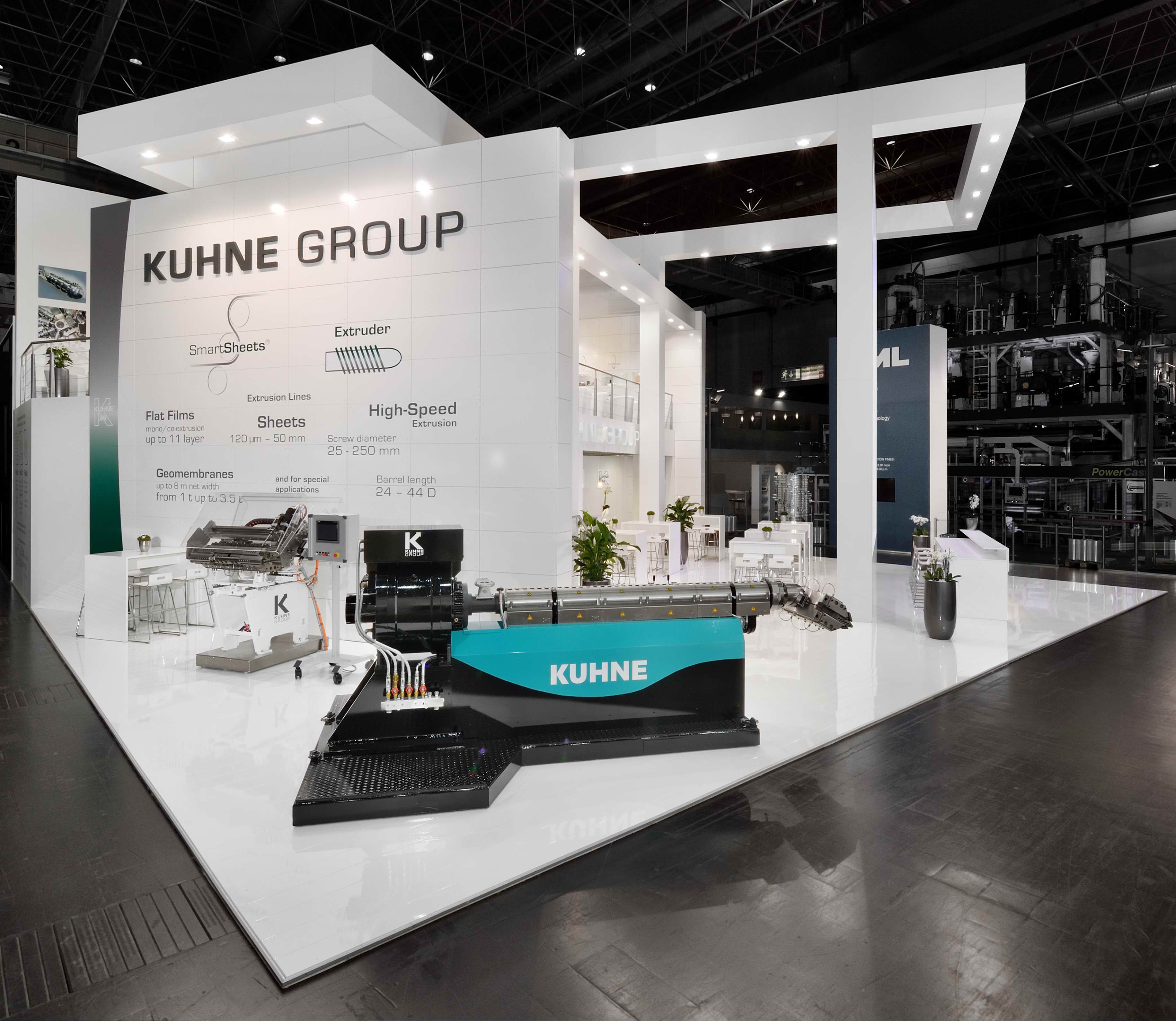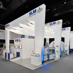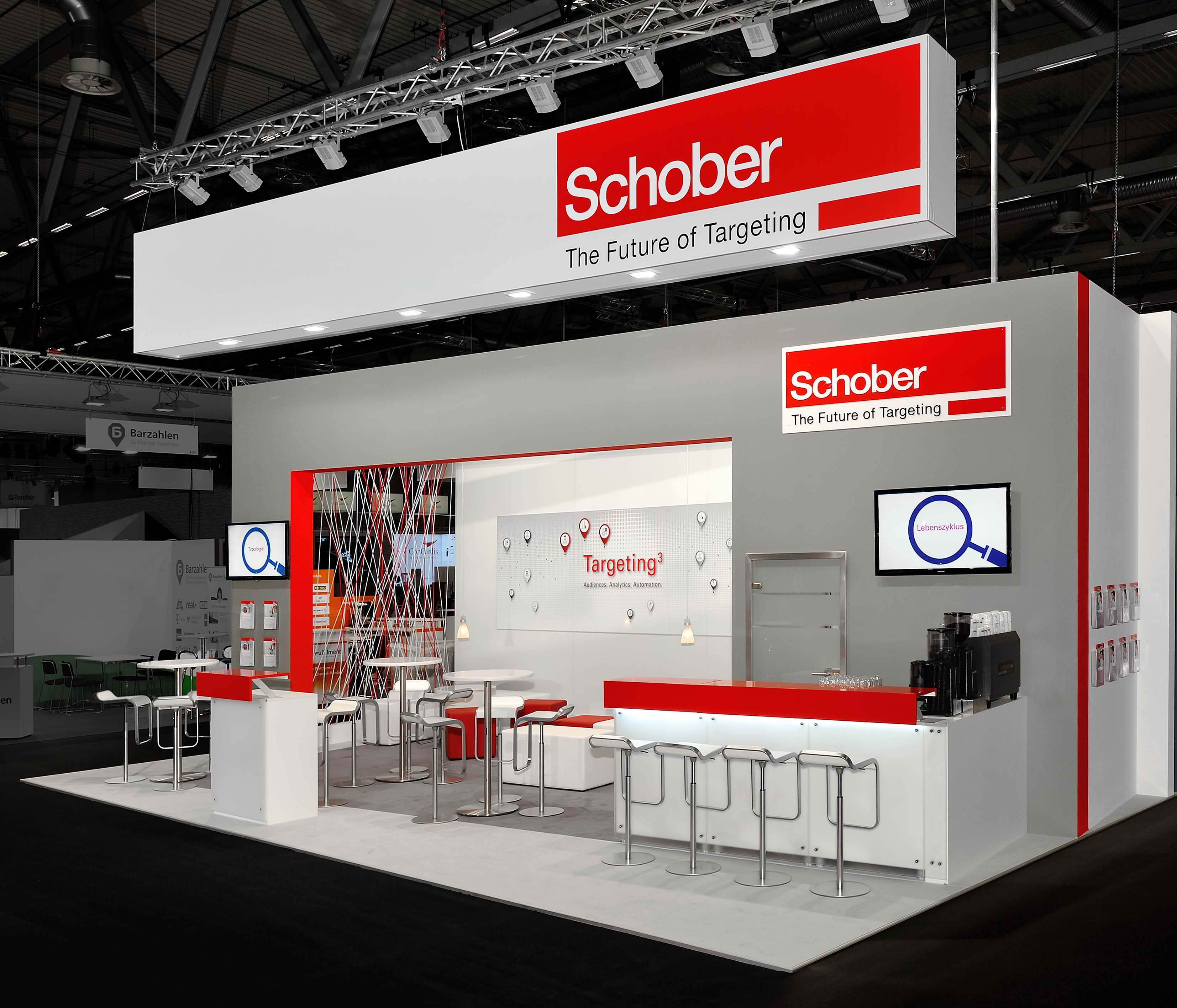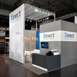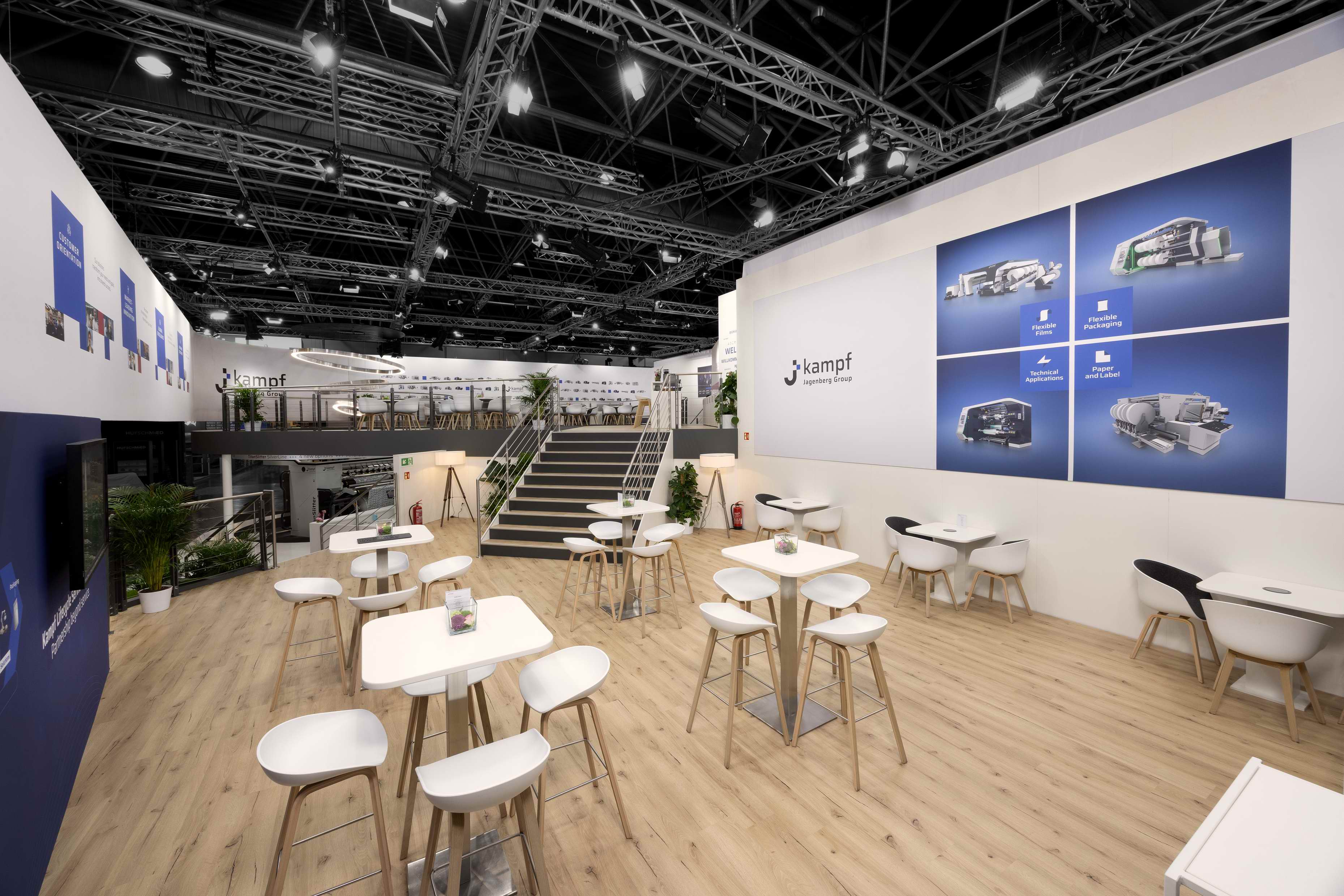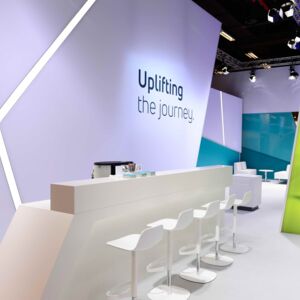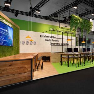 Neben dem mannshohen 3D-Schriftzug – die Buchstaben „n“ und „m“ bilden quasi das Portal zum Besprechungs- und Bewirtungsbereich – springt vor allem das abgehängte grüne „S“ als Deckenelement ins Auge. Diese schwebende Struktur bildet eine Klammer über die verschiedenen Standelemente hinweg und verbindet die einzelnen Stationen zu einem logischen Ganzen. Gleichzeitig wird auf eine klassische Standbegrenzung und eine durchgehende Bodengestaltung verzichtet, so dass die Struktur noch deutlicher „von oben“ vorgegeben wird.