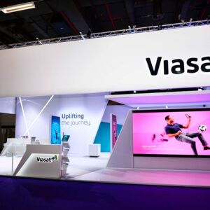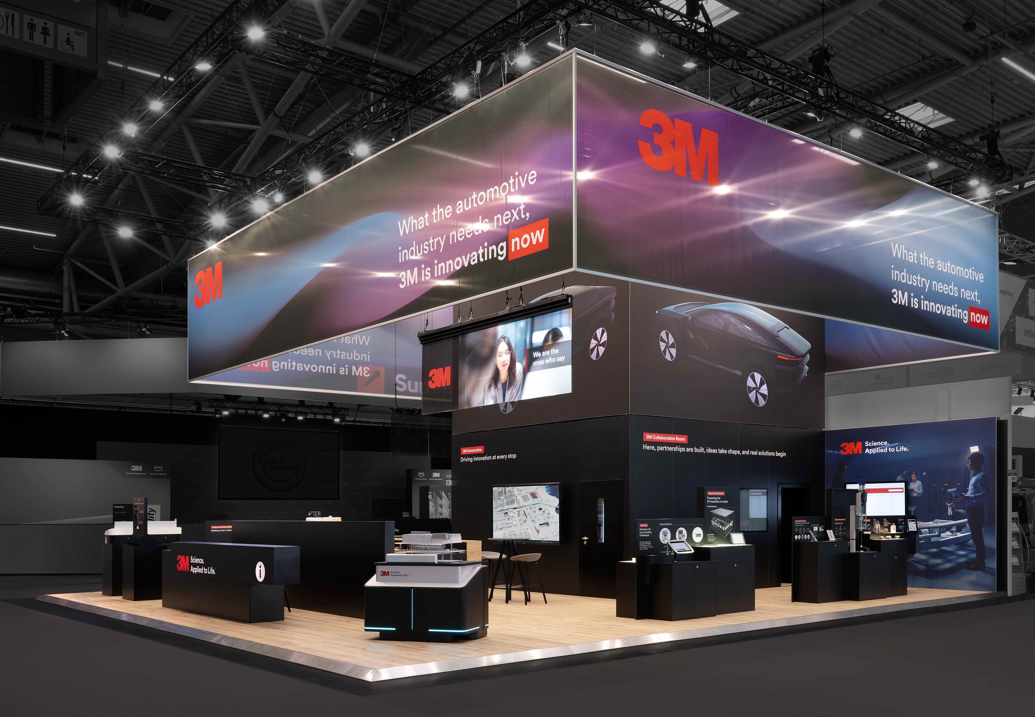 Medial befindet sich auf der Haupt-Standfläche neben einer großen, gebogenen LED-Wand, mehrere abgehangene transparente LED-Vorhänge und Screens, um für die notwendige Fernwirkung zu sorgen.